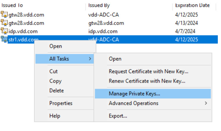 4. Нажмите правой кнопкой мыши на сертификат и выберите All Tasks (Все задачи) → Управление закрытыми ключами (Manage Private Keys).
